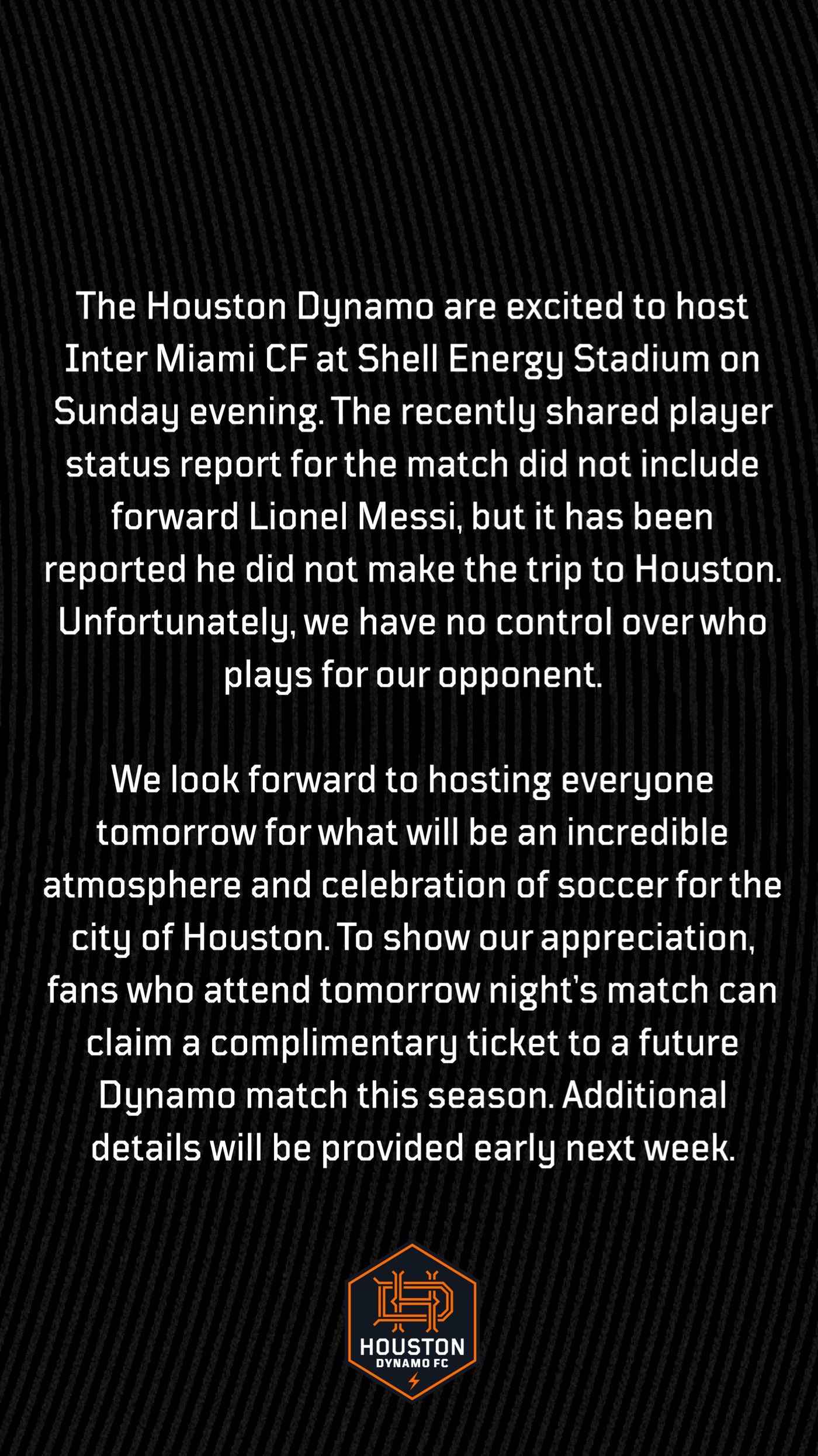 অন্যদিকে, মেসি যে খেলবেন না সেটি জানার পরই পরিস্থিতি আঁচ করতে পেরে তাদের কালকের ম্যাচের প্রতিপক্ষ হিউস্টন একটি বিবৃতি দিয়েছে।