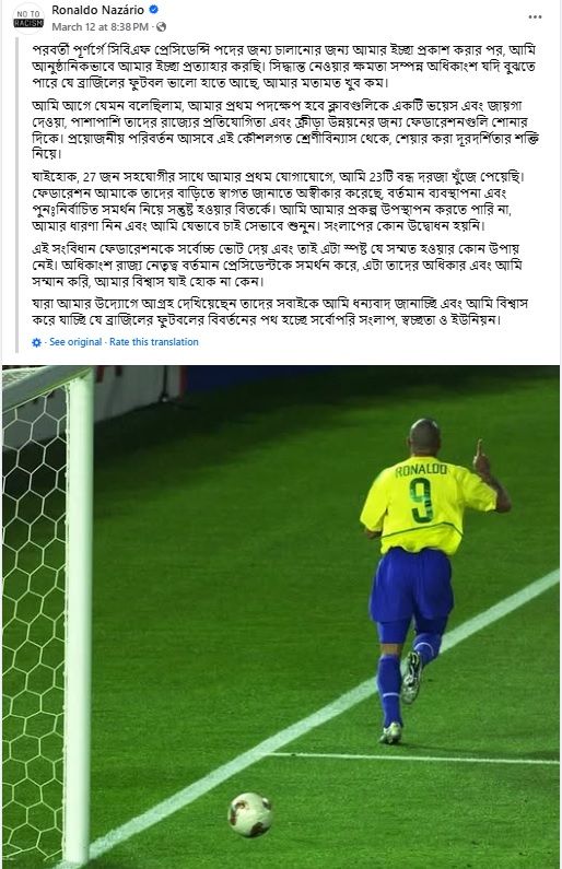 নির্বাচন না করার বার্তা দিয়ে সামাজিক যোগাযোগমাধ্যমে রোনালদো নাজারিও লেখেন,