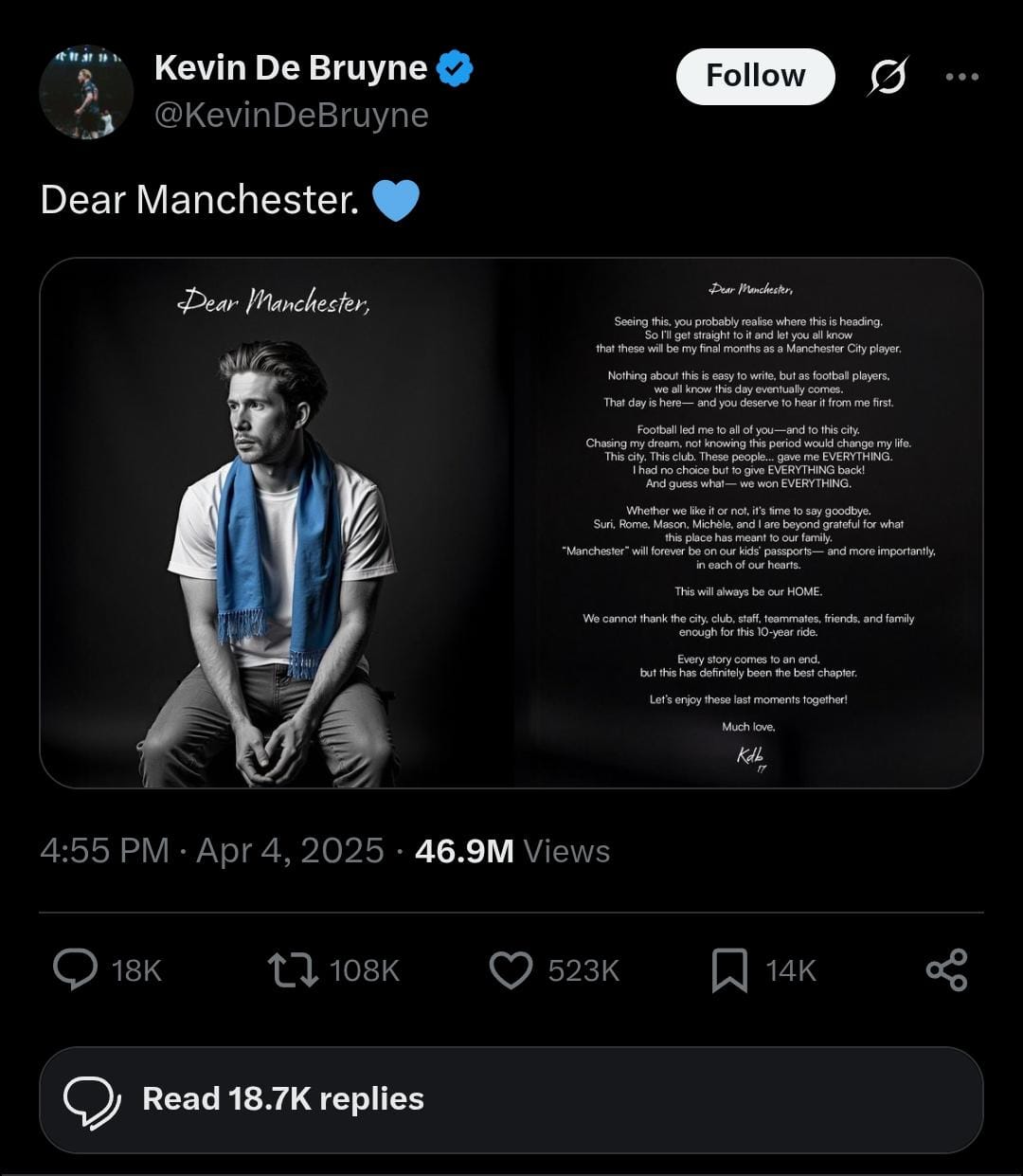 সামাজিক যোগাযোগমাধ্যমে এক বিবৃতিতে ম্যান সিটি ছাড়ার ঘোষণা দিয়ে ডি ব্রুইনা লিখেছেন,