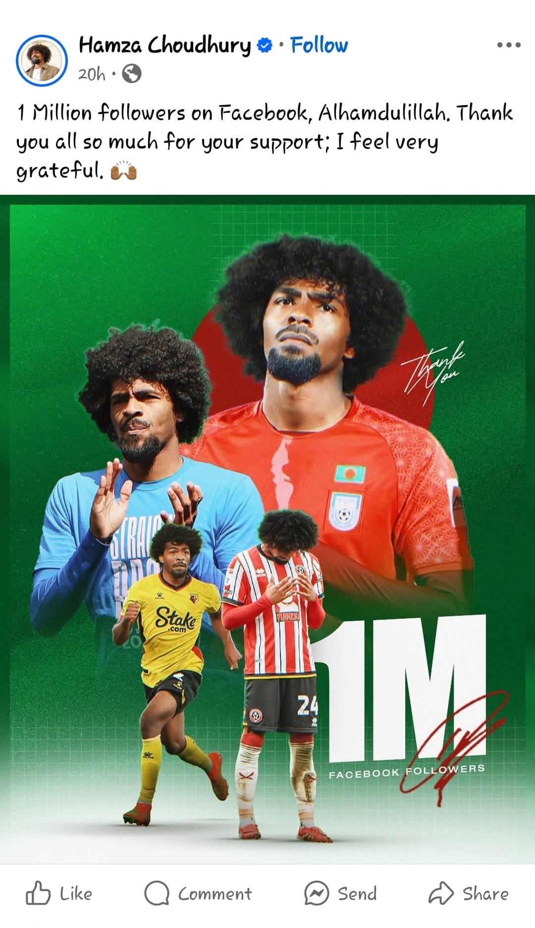 গত অক্টোবরে সামাজিক যোগাযোগমাধ্যম ফেসবুকে একটা পেজ খুলেছিলেন হামজা চৌধুরী। যেখানে খুব বেশি নিয়মিত নন তিনি। তবে পেইজের বয়স এখনও ছয় মাস না পেরোলেও, সেখানে হামজার অনুসারির সংখ্যা এরই মধ্যে পেরিয়েছে ১ মিলিয়ন।