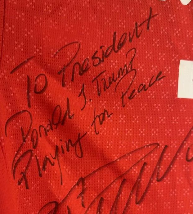 বার্তাটি পড়ে শোনানোর পর প্রেসিডেন্ট ট্রাম্প উত্তর দেন, ‘ওহ, এটা ভালো লেগেছে। শান্তির জন্য খেলা।’ এরপর জার্সিটি তুলে ধরে তিনি বলেন, ‘এটা দারুণ!’