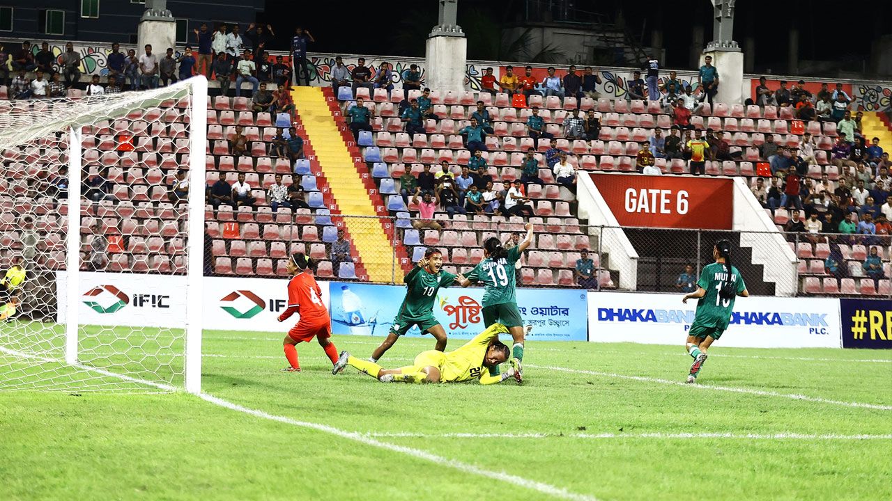 সেই বল ডান পাশে ফাঁকা পেয়ে ফিরতি শটে জালে জড়ান সিনহা জাহান শিখা। চলমান সাফে যেটা তাঁর দ্বিতীয় গোল।
