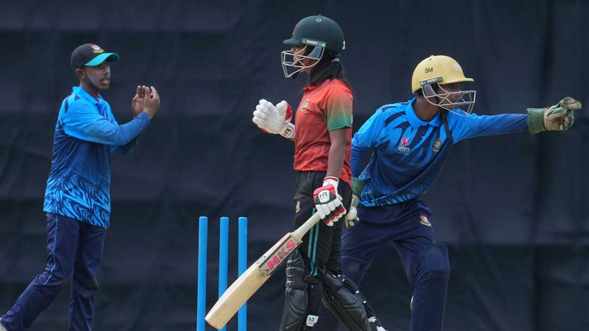 অমিত কুমারের বলে শারমিন বোল্ড হওয়ার পর আসা-যাওয়ার মিছিলে যোগ দেন লাল দলের ব্যাটাররা।