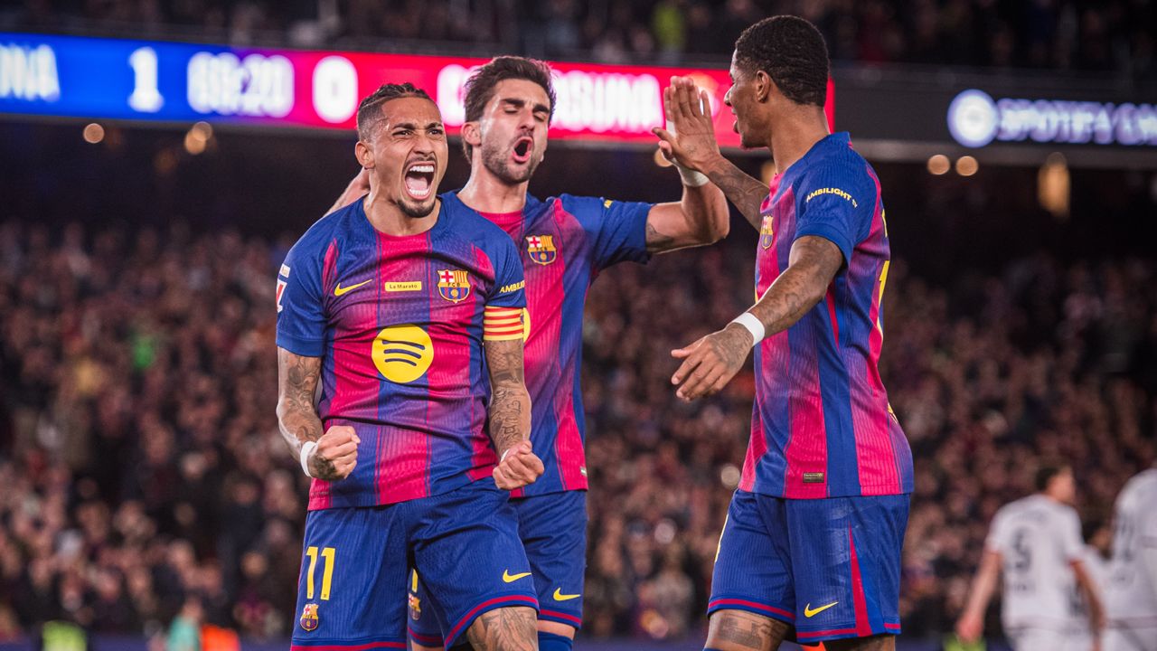 লা লিগার শিরোপার দৌড়ে রাফিনিয়ার জোড়া গোলে রিয়াল মাদ্রিদের ওপর চাপ বাড়িয়ে শীর্ষে বার্সেলোনা। শনিবার রাতে ওসাসুনাকে ২-০ গোলে হারিয়ে পয়েন্ট তালিকায় শীর্ষস্থান আরও সংহত করেছে কাতালান ক্লাবটি।