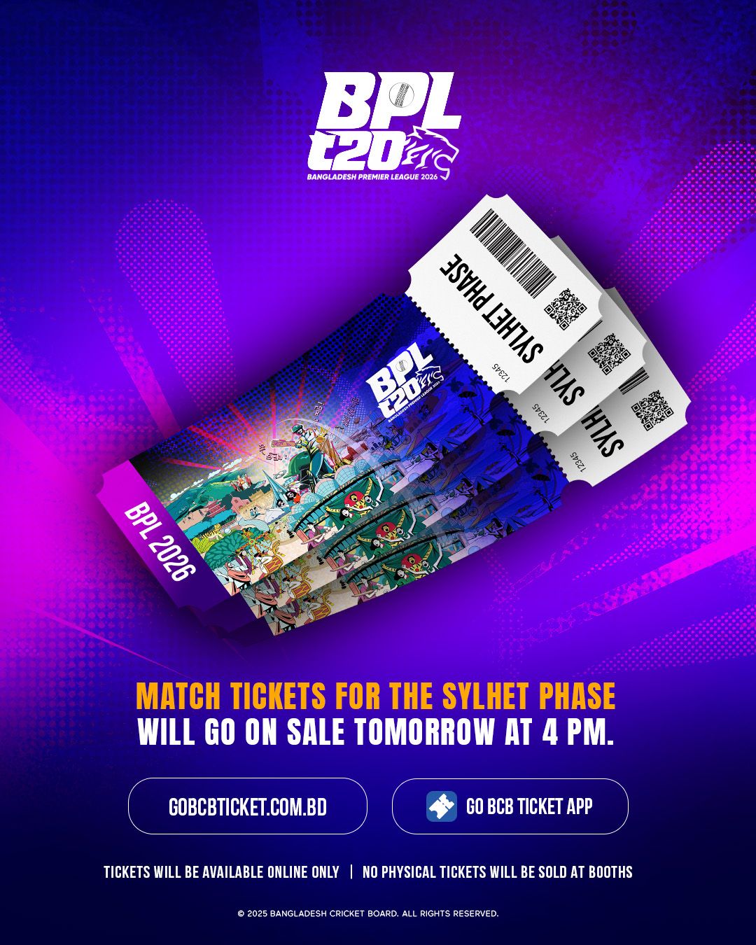 সব টিকিটই বিক্রি হবে অনলাইনে। মাঠে বা ভেন্যুতে থাকছে না কোনো টিকিট কাউন্টার।